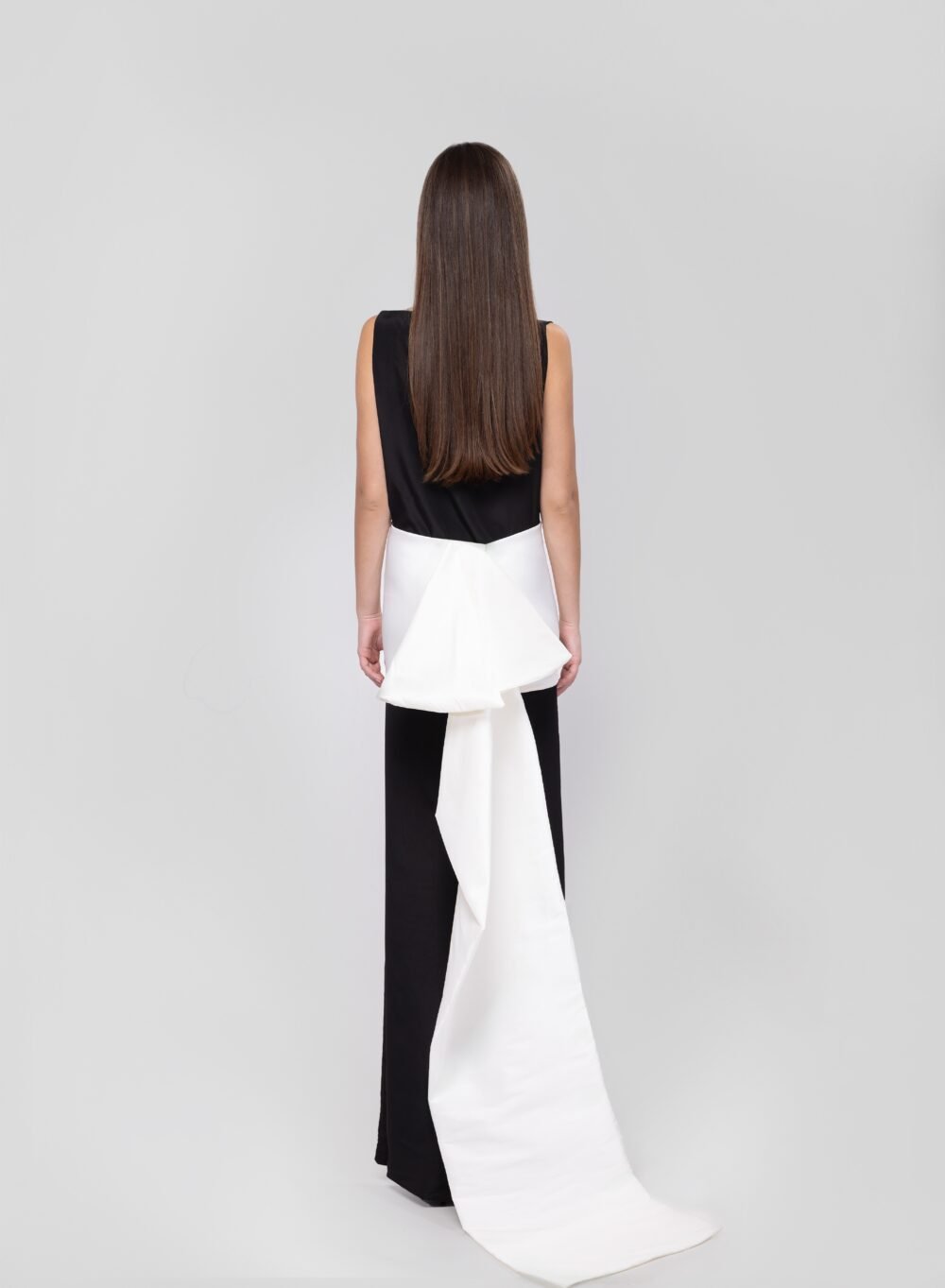 Minimalism elevated to art. This two-piece gown features a sleek black silk dress paired with an off-white taffeta silk overskirt that trails behind with dramatic elegance. The boat neckline and side cutout lend a modern edge, while the clean silhouette ensures timeless sophistication.