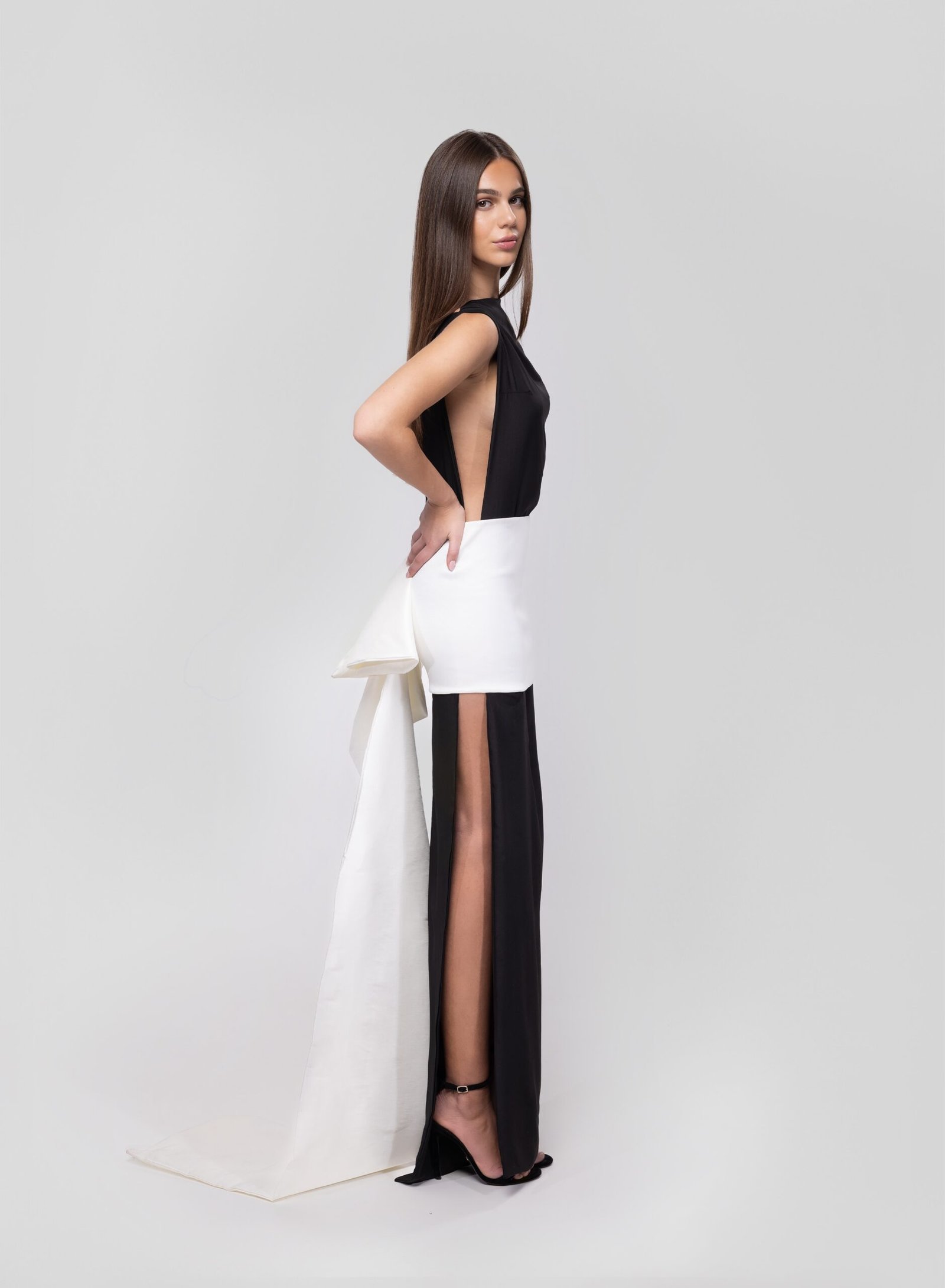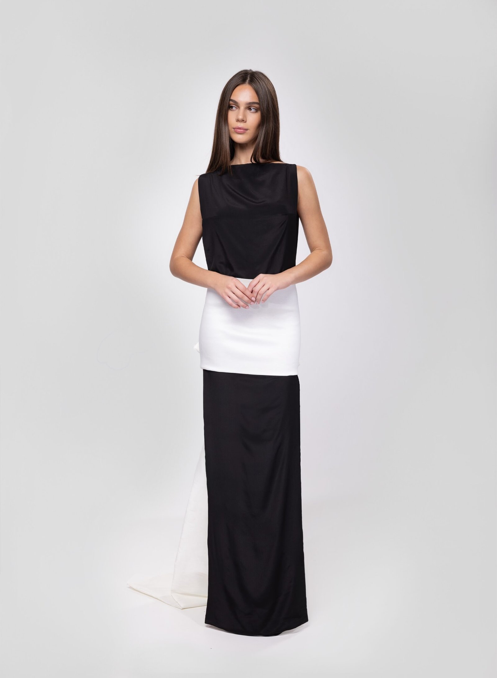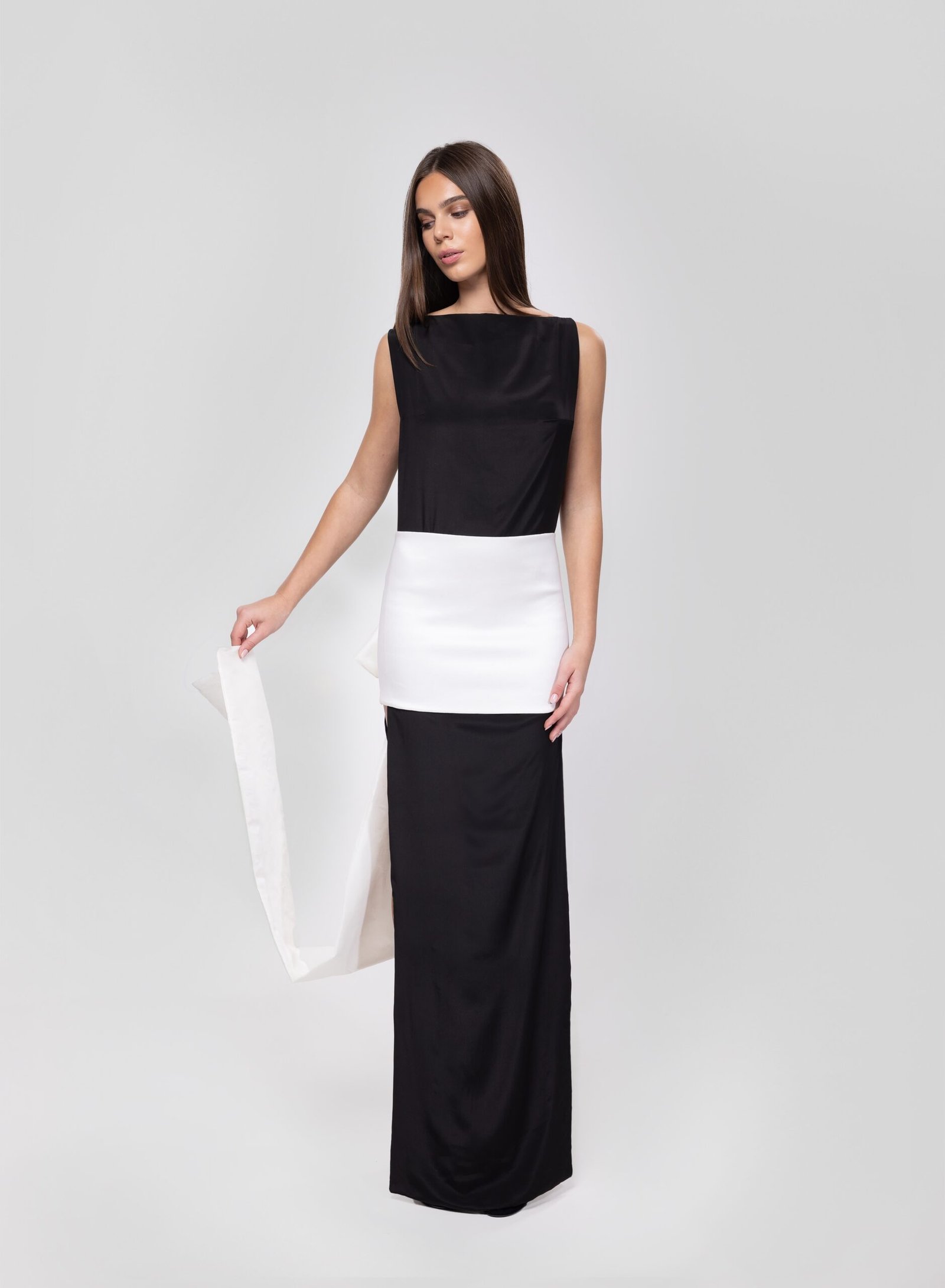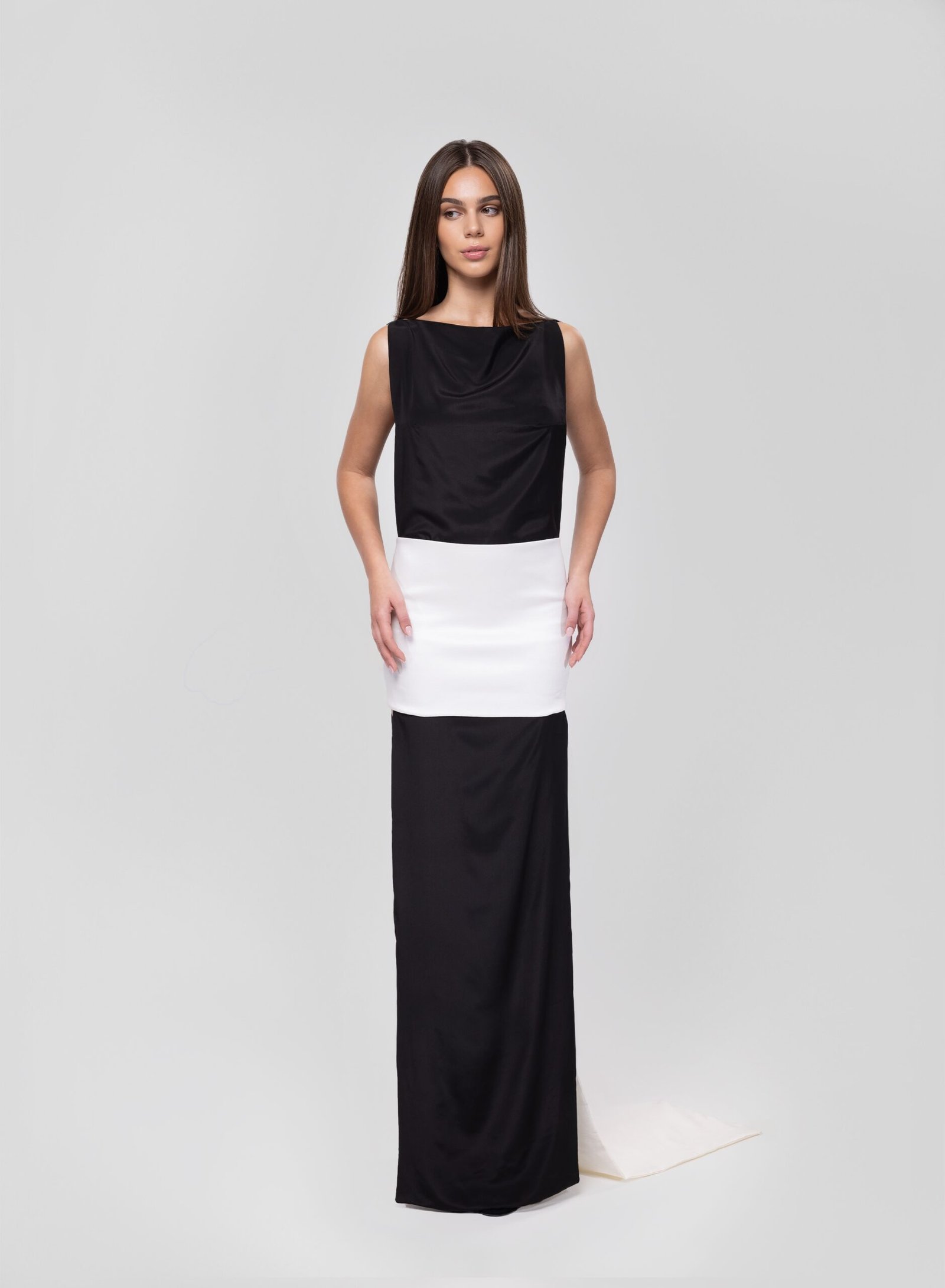 Minimalism elevated to art. This two-piece gown features a sleek black silk dress paired with an off-white taffeta silk overskirt that trails behind with dramatic elegance. The boat neckline and side cutout lend a modern edge, while the clean silhouette ensures timeless sophistication.