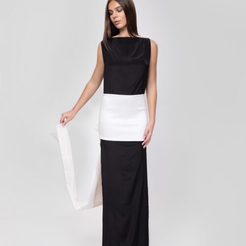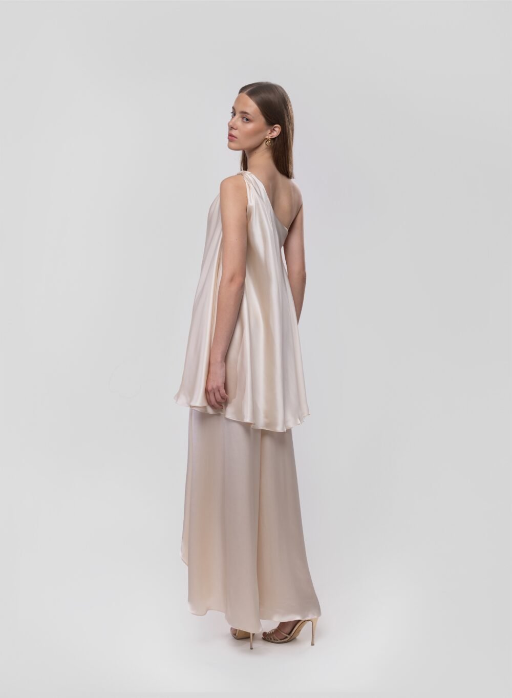 Effortless elegance in motion. This two-piece champagne silk charmeuse set features a long asymmetrical top with a twisted shoulder strap detail and flowing wide-leg trousers. Designed for ease and grace, the trousers move delicately with every step, slightly shorter in front for a soft, airy effect.