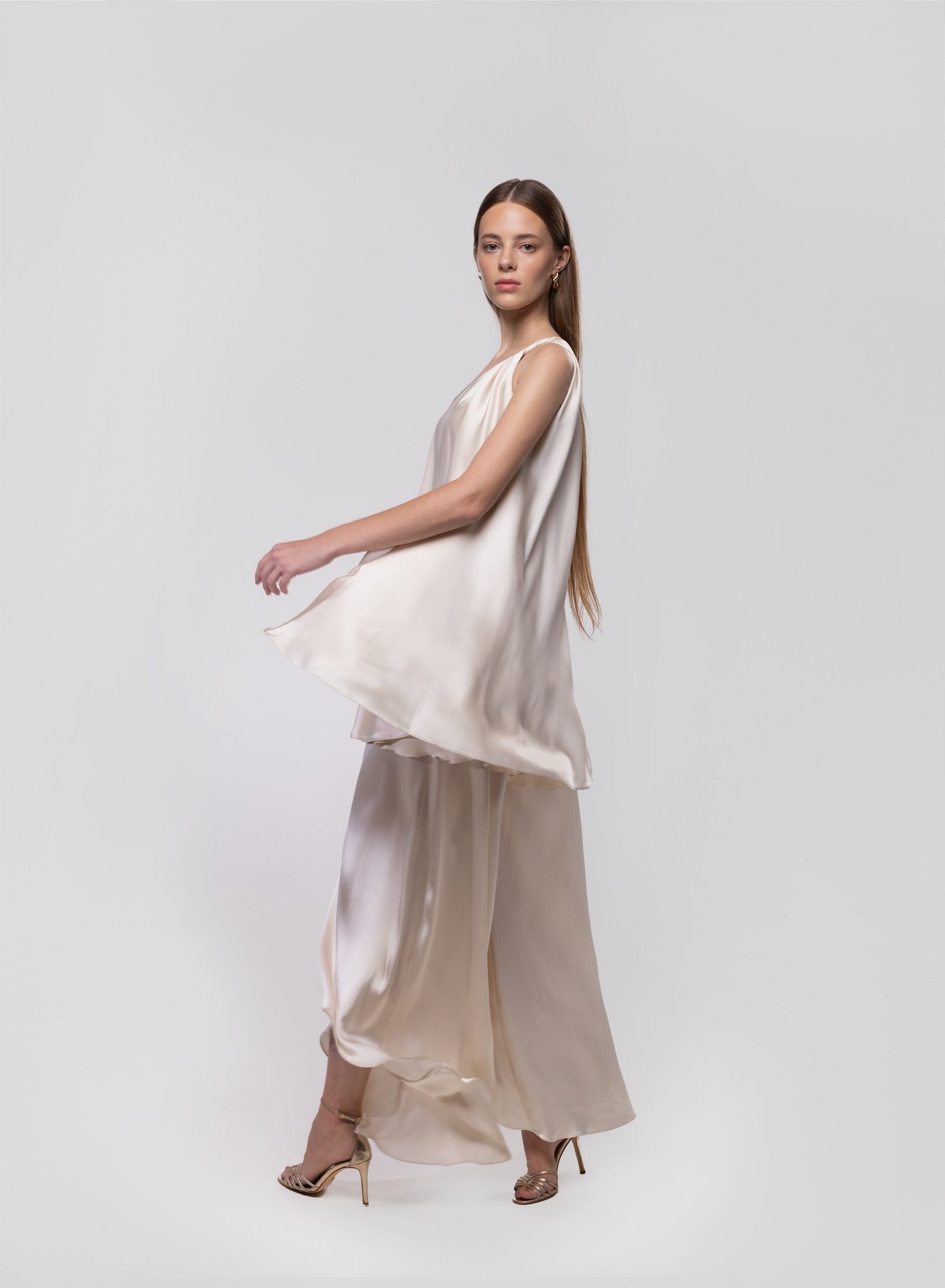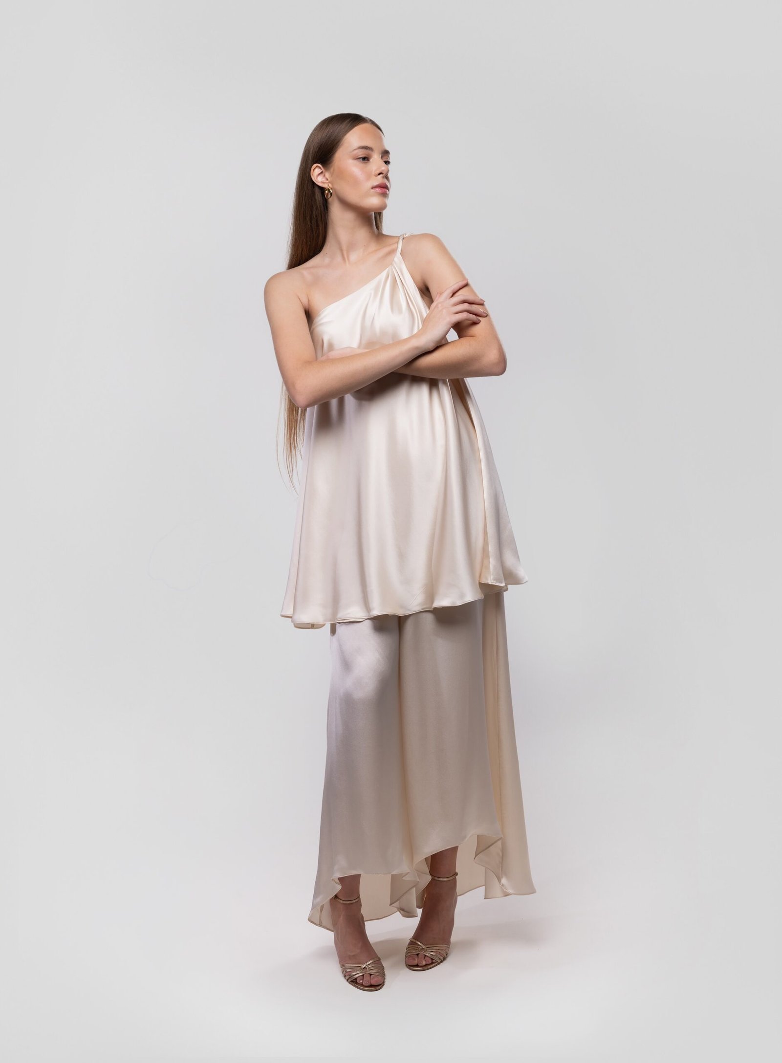 Effortless elegance in motion. This two-piece champagne silk charmeuse set features a long asymmetrical top with a twisted shoulder strap detail and flowing wide-leg trousers. Designed for ease and grace, the trousers move delicately with every step, slightly shorter in front for a soft, airy effect.