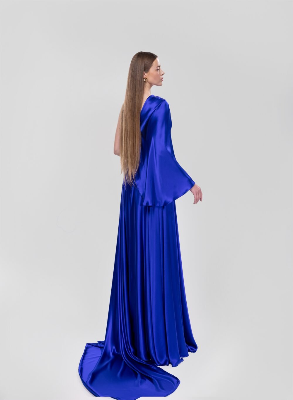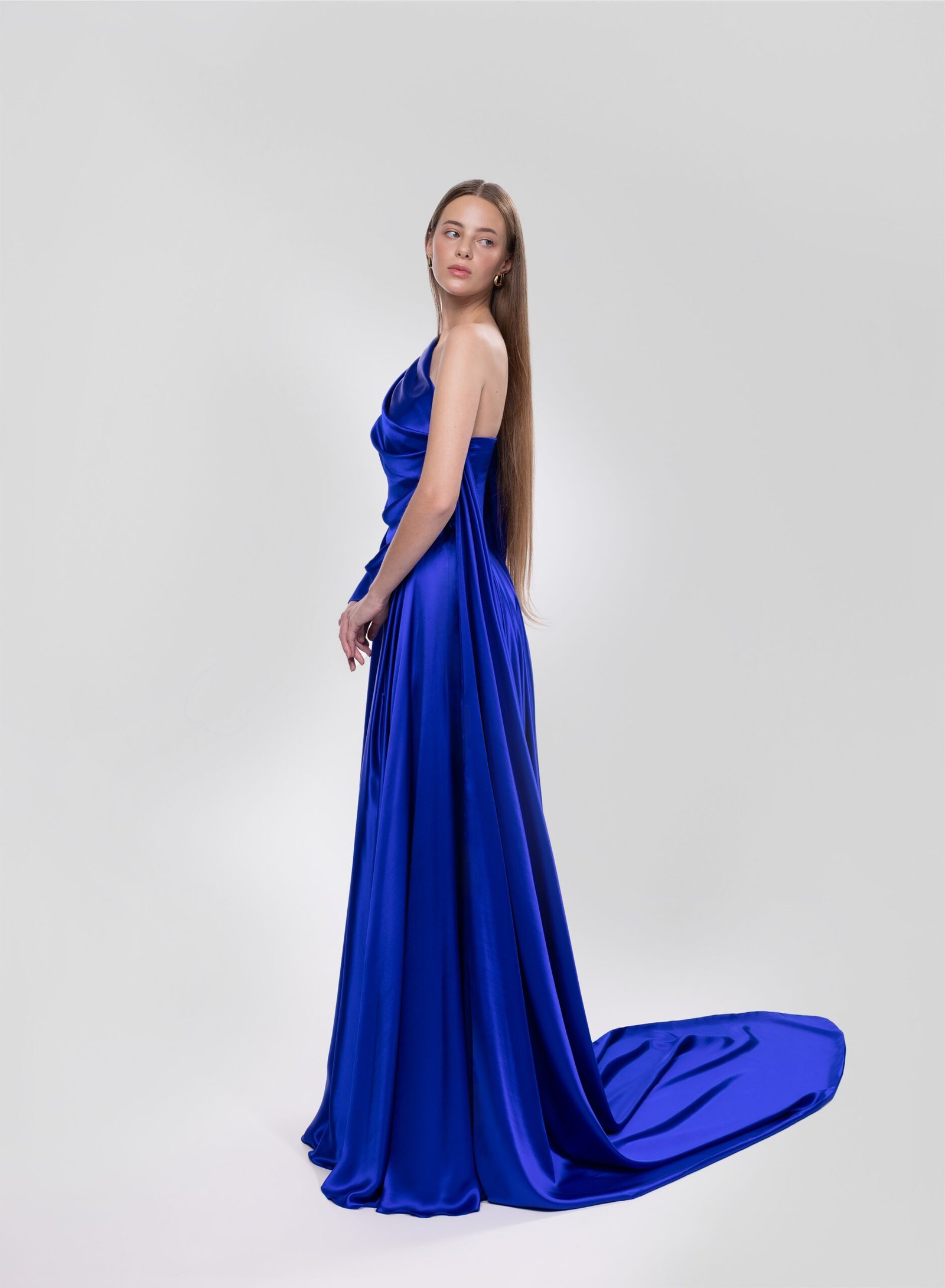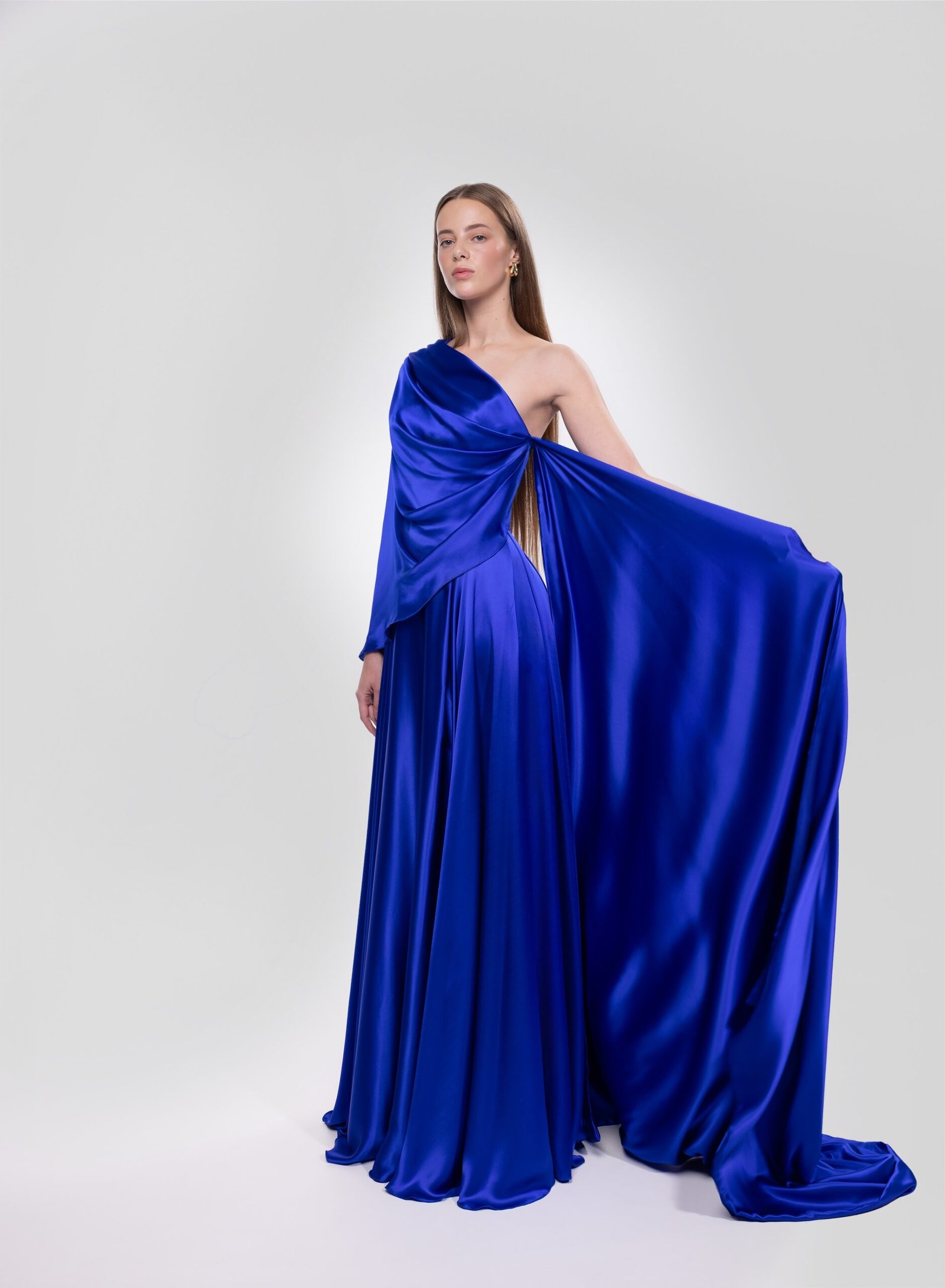 An ode to modern royalty. This royal blue silk charmeuse gown captures the commanding grace of a queen with its asymmetrical neckline and fluid cape that moves with poise and power. The gathered waistline accentuates the silhouette, while the luminous finish of the silk evokes an aura of luxury and serenity. A true statement piece for the woman who reigns with elegance.